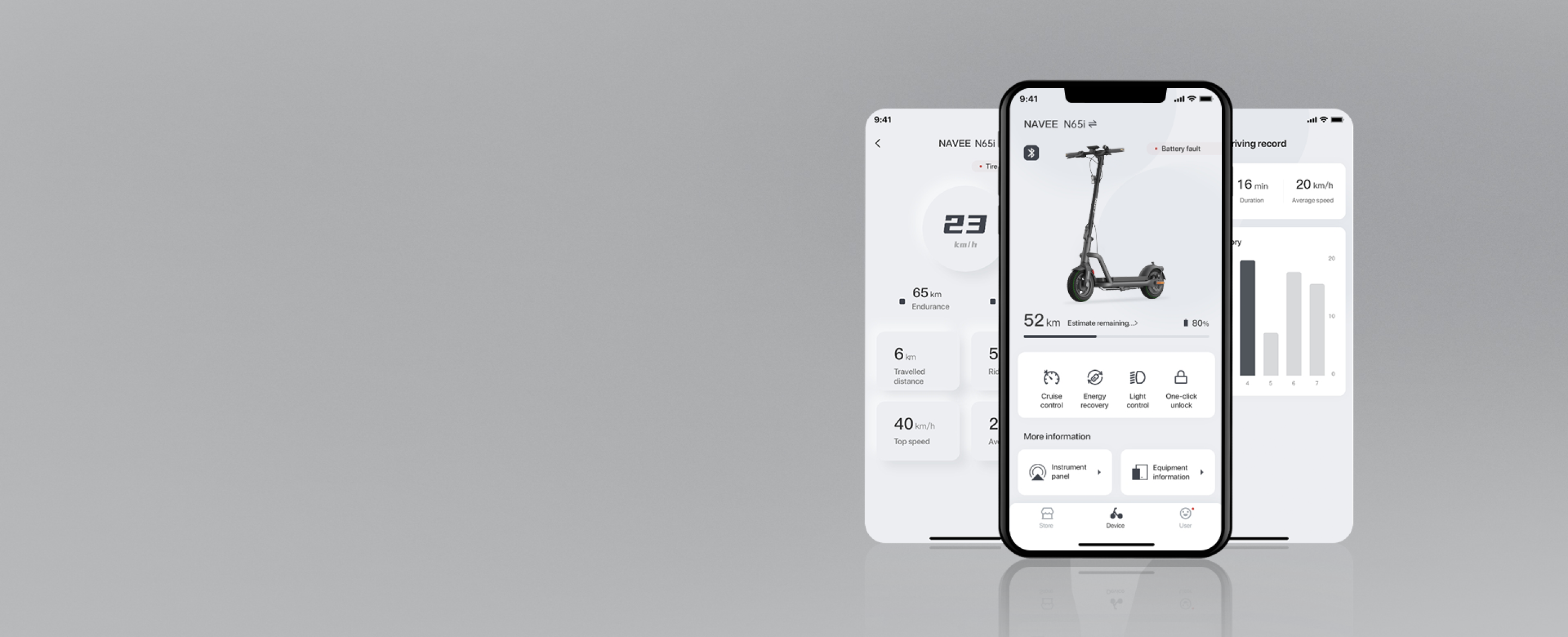 Tijdens het rijden activeer je de energieterugwinning door de remhendel in te knijpen of de gashendel los te laten om te glijden. Een deel van de kinetische energie wordt dan omgezet in elektrische energie voor opslag en hergebruik. Energieterugwinning kan de actieradius vergroten en biedt tegelijkertijd een remmend effect. Bij eerste gebruik wordt aanbevolen het niveau in te stellen op "Zwak". Na verbinding met de NAVEE APP kun je via de hoofdpagina van het product onderaan de intensiteit van de energieterugwinning instellen. De standaardinstelling is zwak, maar je kunt kiezen uit drie niveaus: zwak, gemiddeld en sterk.
